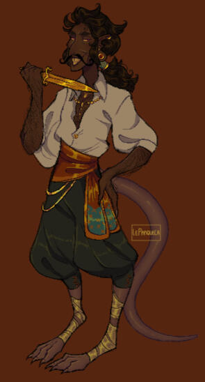 Rat is a ex-pirate half human and half rat, a trickster who uses wit and deceit to attain his goals, preferring to end disputes verbally instead of by force. He walks with a slightly drunken swagger and has slurred speech and flailing hand gestures. Rat is shrewd, calculating, eccentric, and eletric. Despite all of this, he can be quite a failure and emotional man, clumsy and funny. He's quick to anger and demands respect.He's an expert in guns and armory, and knowing how to build traps to any kind of creature. He's the one that normally plans out how the 'robbery' will work out when his gang, The Bad Boys, wants to do another stealing. He likes jewerly and drinking, and can be quite a gentlemen when he wants to impress a lady, speaking in french even. He's forty two years old and stands in five feet and nine inches. He's an ESTP personality character.