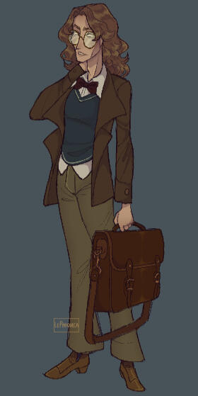 James is a british man best described as mild-mannered, loyal, smart, and clumsily straightforward. A very upright and dedicated young man. While well intentioned, he often causes trouble for other people caused by his determination to solve all his cases. Comes off as clever and likable, even if his fellow coworkers dismiss him as a basket case, what results in him to progressing by his own, using his bookish expertise to guide himself and his boss, detective Flames, who he's always looking up to and sees as a major inspiration.He loves adventures and new informations, from wherever they come from, and oftenly feels bad for being "soo weak" compared to others. Sometimes socially awkward, he tends to be logical and base his decisions in objective informations than in his own feelings. Really wishes to join a big cause just in order to impress his boss, who works as an father figure to him, and help people.He's twenty three years old and stands in five feet and seven inches, but wishes to be taller. He carries a bag everywhere full of his materials, having the need to also wear glasses to see everything, otherwise he's "blind". He's the owner of Mrs. Mintirlli Charlotte II, a red lahore pigeon. He's an INTP personality character.