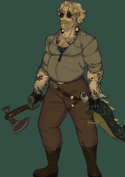 Crocodile is a half crocodile mutant whose personality is shown to be aloof, grumpy, sarcastic and standoffish, but is otherwise loving and courageous. He acts like a overprotective father, and could would handle a crowd of revolted people only using his two big, giant arms and a axe. He's got a sad, lonely backstory. After being kidnapped from his son, and later discarded by a cult of scientists as a 'failed experiment', Crocodile becomes the literal legend of the Lech Ness monster, when his giant form of a crocodile is shown travelling around and lonesomely. That was until he met up with Rat, a pirate half human and half animal, just like him.Years later, they met up with Miss, all left behind in a desert. They slowly develop their gang: the bad boys. Crocodile becomes Miss's advicer and Rat becomes their funny guy, and she, of course, the leader. Meantime, he always tries to get along with his son, who's got old and is already a sucessful lawyer. Crocodile is fifty seven years old and is the second most tall of my ocs, in seven feet and eight inches, only losing to Sevika. He's an ISTP personality character.
